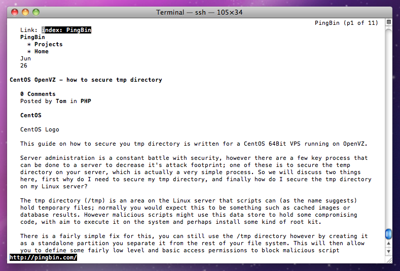 It is only a text based browser (as you can screen from the screenshot above), so it will not attempt to display any images, and it has no support for Javascript - However it's really simple to use, and supports navigating SSL, navigation via Links and it extremely lightweight.