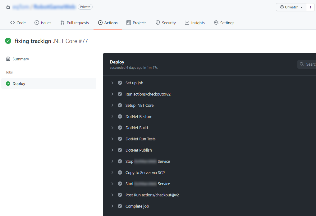 What we're using for this is Github actions, basically every time that we check code into Github it will automagically build the application, and copy the resulting files to our server and restart the service as needed, this is continuous deployment - You can also have Github run other tasks such as Unit tests on your code during the deployment, to ensure it's working and safe.