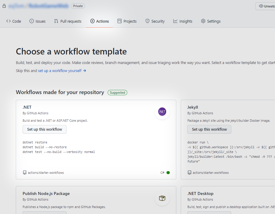 So login to Github and go over to the Actions tab on your repository and create a new work flow - There is a .NET workflow which you can select, or even just the "setup a workflow yourself" will do, as the full script you need is given in detail below.