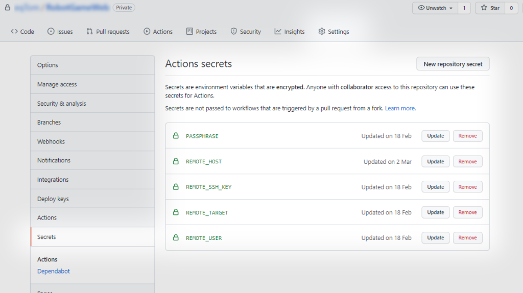 What we're using for this is Github actions, basically every time that we check code into Github it will automagically build the application, and copy the resulting files to our server and restart the service as needed, this is continuous deployment - You can also have Github run other tasks such as Unit tests on your code during the deployment, to ensure it's working and safe.