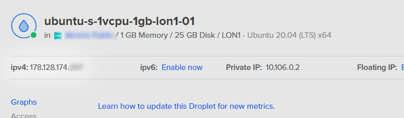 Once the Droplet has finished building you should see it's Public IP address which you should now be able to SSH to, remember that you'll need to connect using the SSH Key provided when building the Virtual Machine.